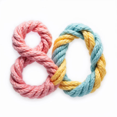 The number 80 is made from colorful braided yarn, on a white background, an illustration for a birthday card.