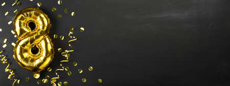 gold foil balloon number eight or eighth. Birthday greeting card with the inscription 8.black concrete background. Celebrating the anniversary. Banner. copy space