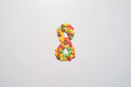 Numeral eight from sweet pastry topping in the form of colorful foliage on a white background.