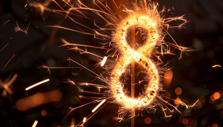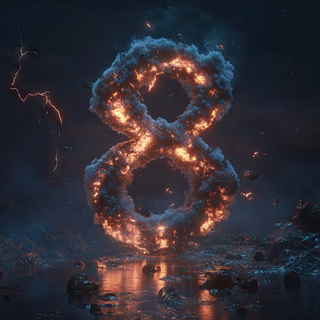Dramatic digital illustration of the number eight, formed from a fiery, smoky cloud, set against a dark, stormy landscape with a body of water reflecting the light. Lightning illuminates the scene.