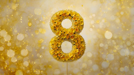 Volumetric golden shiny number eight on the background of a flower shop. International Women's Day. Mother's Day