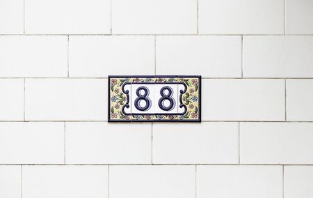 Number 68 in Gothic style carved and painted on the outside of a house in Mayfair, London.