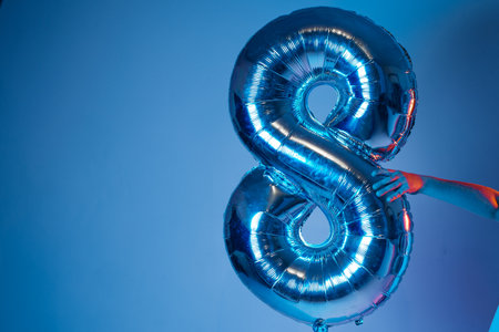 This captivating image features a creative floral arrangement of daisies and greenery shaped into the number eight, set against a vivid blue background, symbolizing celebration and beauty in nature.