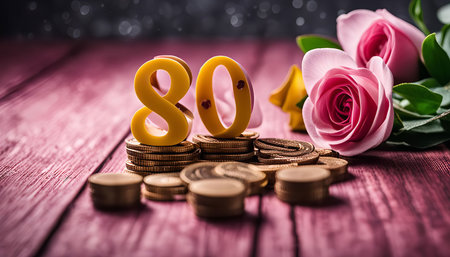 Yellow 80 number candles, golden coins and two pink roses on wooden table.