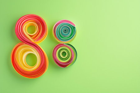 Colorful paper spirals forming the numbers and on a vibrant green background, representing creativity, joy, and celebration in a playful style