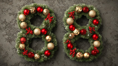 Number 88 made of Christmas tree branches with red and golden baubles on concrete background
