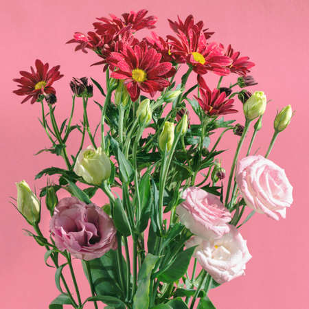 Bouquet of beautiful chrysanthemums and eustoma flowers in natural light on a pink background.
