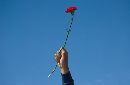 Hand holding a red carnation flower in the blue sky background.