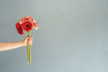 Happy birthday flowers, Bright gerbera daisies in woman hand on blue wall background, minimal style, copy space