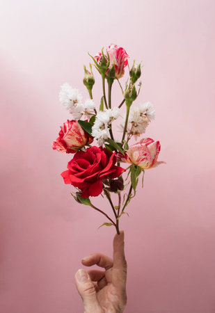 Bouquet of red roses and white flowers rests on the finger on light background.