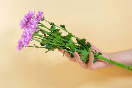 Bouquet of chrysanthemums in a female hand on a yellow background. Natural cosmetics, hand care products.