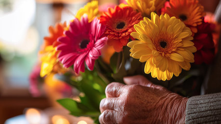 Elderly hands holding a vibrant bouquet of gerbera daisies. Concept of love, care, and nature appreciation. Beautiful mix of red, orange, and yellow flowers symbolizing warmth and affection.