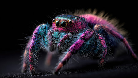 A detailed image presents a jumping spider with striking blue, pink, and purple coloration. The spider is set against a dark backdrop, emphasizing its texture and intricate features. This studio shot showcases the arachnid in high resolution. Suitable for use in educational materials or artistic projects.