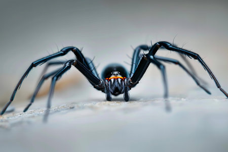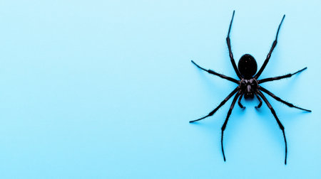 A striking close-up image of a black spider against a soft blue background. The spider's intricate details and contrasting colors create a captivating visual experience ideal for educational and artistic use.