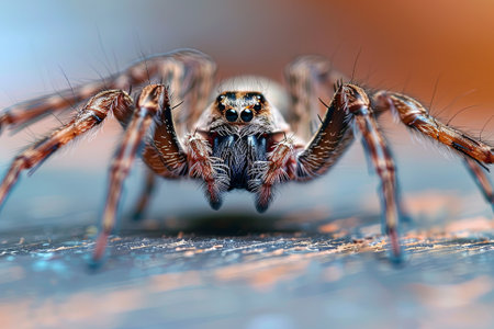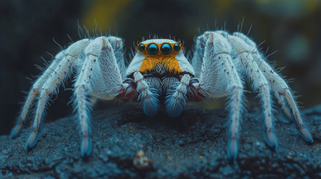 This close-up showcases the remarkable details of a spider's anatomy, highlighting its hairy legs, large eyes, and distinctive mouthparts against a softly blurred background.