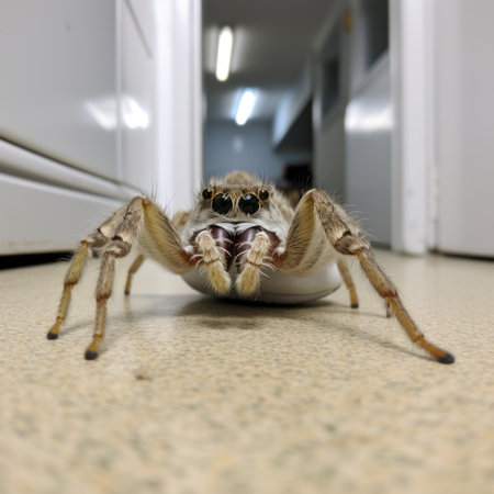 A sizeable arachnid with multiple eyes, known as a spider, rests on a wooden surface. This terrestrial organism, an invertebrate pest, is a type of arthropod commonly found indoors