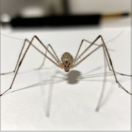 A Daddy longlegs spider is captured in detail as it perches delicately on skin. Showcasing complex body structures and natural lighting, Wulai, New Taipei City.