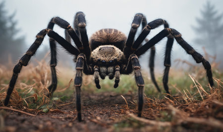 A large spider crawls across the forest floor on a misty morning