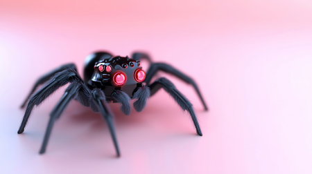 A small, dark toy spider with bright red eyes stands prominently on a soft pink surface, creating a striking contrast.