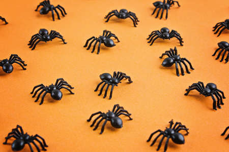 Halloween background with spiders as symbols of Halloween on the orange background.