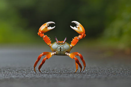 Full body photo of A crab standing on its hind legs, facing the camera, with one leg up in front and open claws showing. The background is concrete road surface. The focus point should be centered around them. High resolution photography, taken using Canon EOS R5 F2 ISO100 89MM LENS NIKKOR, Leica M6 Super wide angle lens, professional color grading --ar 3:2 --v 6.1 Job ID: 0c048a5c-3e5b-40f1-a9ea-7197f5381361
