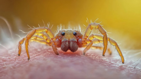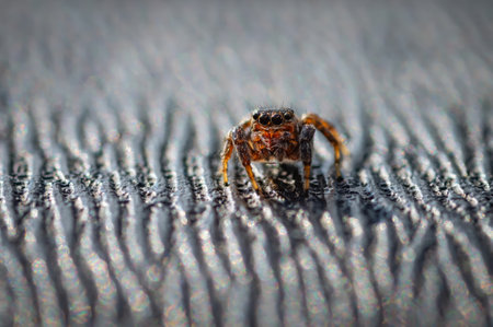 Small jumping spider walking on a rough, red surface