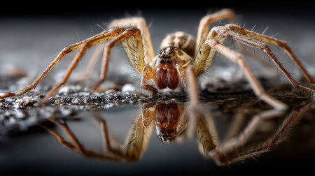 This macro image captures a brown spider in stunning detail, highlighting its intricate features and reflection on a dark surface. Perfect for nature enthusiasts.