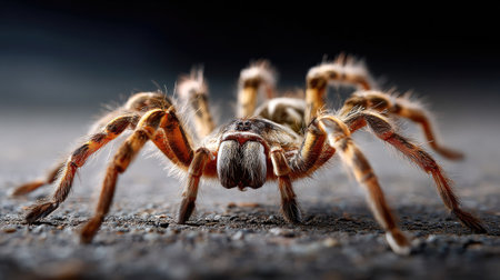 This stunning close-up captures the intricate details of a tarantula spider, showcasing its hairy legs and fanged mouthparts against a dark background.