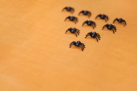 Halloween autumn holiday picture of hand decorative black spiders against orange. Copy space, top view. Raffle concept.