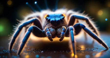 A close-up of a jumping spider, its eyes glowing with an intense light, poised as if ready to leap from a glistening surface into the night. AI generation