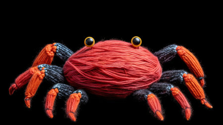 a red silk ball is creatively transformed into a spider costume, resembling knitted and crocheted hyper-realistic animal illustrations. the photo, captured with a ricoh gr iii camera, showcases a cross-processed effect that enhances the dark navy and orange colors. this unique composition pays homage to the artistic style of charles addams and the captivating imagery found in national geographic. ai generated