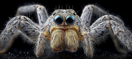 close up of tarantula spider on black background, extreme closeup