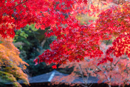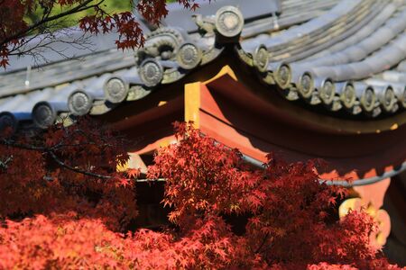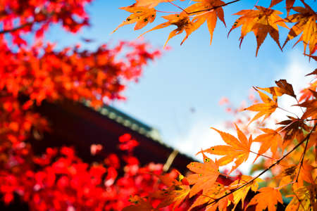 Japanese Maple leaves in autumn with roof of Japanese temple as background, Kyoto, Japan.