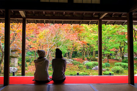 Japanese girls enjoy Autumn colorful Japanese garden at Enkoji temple in Kyoto, Japan. Here is the Rinzai Zen Sect and very famous during fall colors in Autumn.