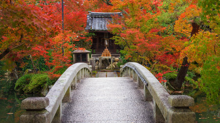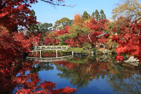 bridge across Hojo pond to Eikan-do Zenrinji shrine with autumn maple leaf colors, Kyoto, Japan. Famous travel destination for tourist sightseeing Kansai in fall.