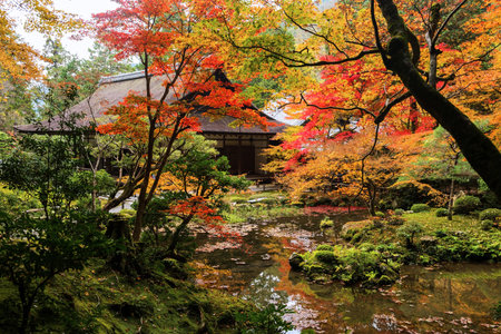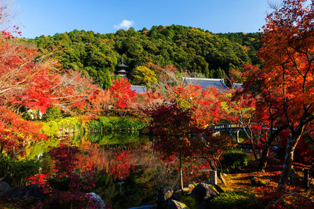 Kyoto, Japan - November, 2017 : Shojuraigousan Muryojuin Zenrin-ji Eikan-do temple. Autumn colors, fall foliage at pond inside garden of Shaka-do hall