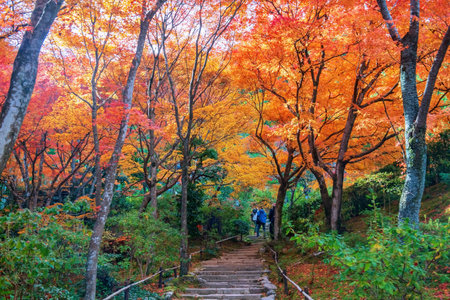 Traveler people walk upstairs to enjoy colorful fall foliage leaves garden at Jojakkoji Temple, Arashiyama, Kyoto, Japan. Famous travel destination in western of Kyoto in autumn season.