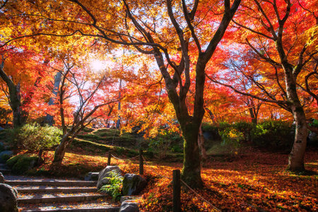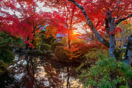 Beautiful autumn maple leaf colors of Eikan-do Zenrinji temple garden against sunlight, Kyoto, Japan. Famous travel destination for tourist sightseeing Kansai in fall season.