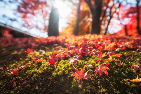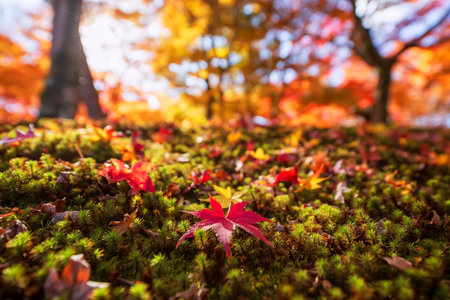 Red maple leaf on moss against blur autumn garden and sunlight at Tofuku-ji temple at peak autumn in December, Kyoto, Japan. travel destination for tourist sightseeing Kansai for fall season.