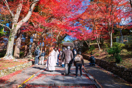 tourists viewing beautiful Maple leaf in Japanese Garden at Enkoji temple, Kyoto, Japan. Landmark and famous in autumn season
