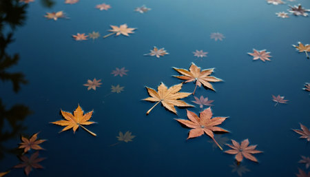A serene image of autumn leaves, various shades of brown and orange, floating on the surface of dark, still water.