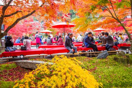KYOTO,JAPAN-NOVEMBER 27,2019:Visitors Enjoying afternoon tea at open air cafe in Eikando Zenrinji temple ,Kyoto.This place is one of tourist destination in autumn.