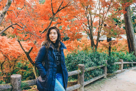 Asian tourist woman posing and smling to camera with autumn garden background in autumn season.
