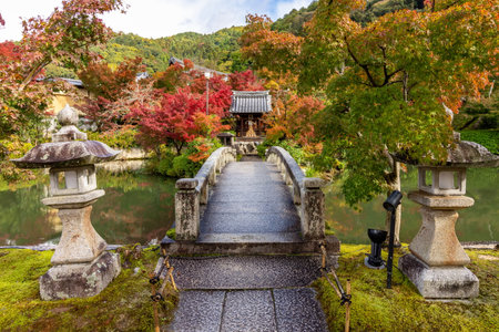 Beautiful autumn colors, Fall foliage and Ishidoro (Stone lantern) gorukaku stone bridge across the Hojo-ike pond to Benten shrine. Eikan-do Zenrin-ji temple. Kyoto, Japan
