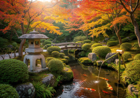 Tranquil Japanese garden scene featuring vibrant autumn leaves, a stone lantern, a small bridge over a stream, and colorful koi fish swimming in the water.