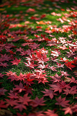 Red maple leaves on the ground in autumn season, Japanese style.