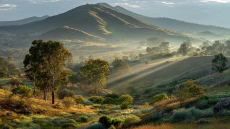 A breathtaking morning scene capturing majestic rolling hills and lush greenery. Soft rays of sunlight pierce through mist, creating a tranquil atmosphere in nature.
