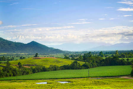Lush green hills rise gently against a bright blue sky dotted with a few fluffy clouds showcasing natures beauty in a serene landscape.