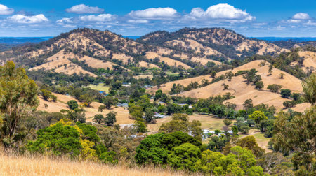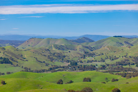 Early morning light over the hills, farmland and Goulburn River between Taggerty and Alexandra in Victoria Australia