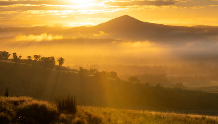 Golden sunrise over mountain landscape, sunlight rays streaming through morning mist, serene valley, silhouettes of trees, atmospheric nature view for relaxation, travel, backgrounds, calm mood